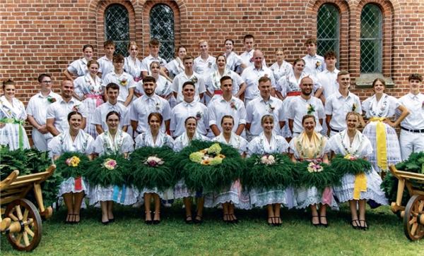 Z Noweje Niwy/Neu Zauche. Za kupkowe foto pśed nowoniwańskeju cerkwju su nosyli žeńske w swójej swěźeńskej drastwje hyšći obligatoriske elegantne carne niske crjeje, ale w slězynje su južo byli pśigótowane sportowe crjeje. Z tymi su mógali pózdźej na sćernišću nejlěpjej chójźiś, teke sportowe wuběźowanje žeńskich w dalokochytanju gumijowych škórnjow su mógali tak lěpjej zmejstrowaś.