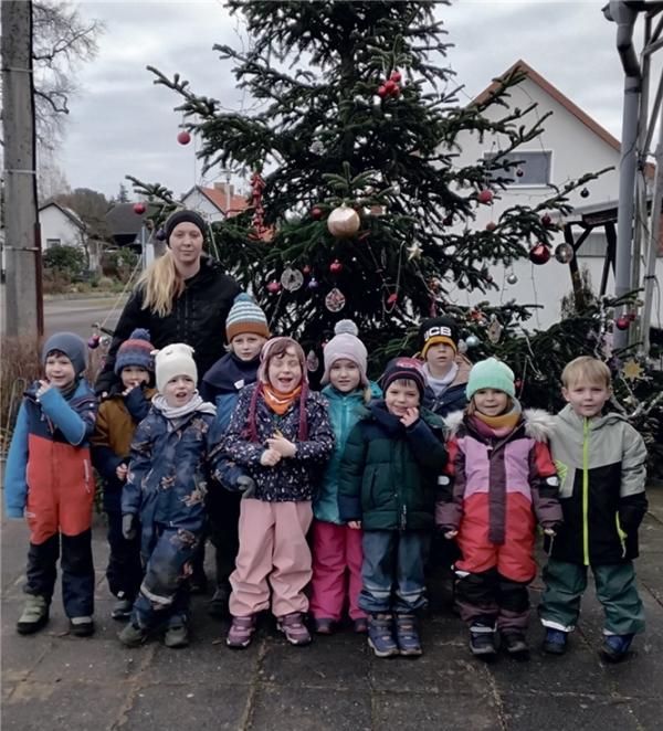 Wie in jedem Jahr haben die Kinder der Kita ,,Lustige Früchtchen“ von Byhleguhre die Tanne vor dem ,,Alten Konsum“ wieder geschmückt. Mit selbst Gebasteltem, Sternen und Weihnachtskugeln bekam sie wieder ein schönes Aussehen. Denn am 1. Advent sollte ja alles schön leuchten. Foto: Monika Schernikau