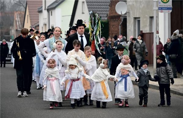 Stöpbitz/Strobice. Ihre 33. Wendische Fastnacht der Neuzeit feierten am Samstagnachmittag 36 Paare – die Frauen und Mädchen in der schmucken wendischen Tracht und die Herren in ihren schwarzen Anzügen mit Hut – im 573 Jahre alten Cottbuser Stadtteil Ströbitz. Nach den ersten Fastnachtstänzen in der Vereinsgasstätte „Auf Wacker“ zog der diesjährige Zapustumzug über die Ströbitzer Hauptstraße zum Wilhelm-Nevoigt-Platz, legte am Denkmal für die Gefallenen in den Weltkriegen und die Opfer von Gewalt eine Gedenkminute ein und formierte sich danach für das Gruppenbild. Auch in diesem Jahr wurde das Erinnerungsfoto vom Burger Fotografen Richard Kliche geschossen.