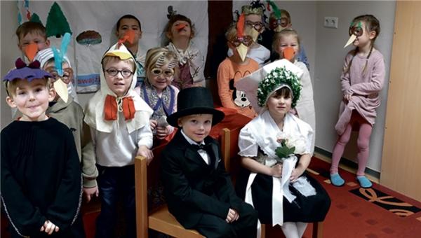 Trebendorf/Trjebin. Die Trebendorfer Sonnenschein-Kinder haben sich schon lange auf die Vogelhochzeit gefreut. Vor allem Merle und Jakob aus der Vorschulgruppe, die das Brautpaar Elster/Rabe sein durften. Für Merle war die Freude doppelt groß: In Trebendorf trägt seit dem vorigen Jahr die Braut die Niederlausitzer Hochzeitstracht. Möglich wurde das, weil die Kita sich am vom Landkreis Spree-Neiße unterstützten Projekt zur Förderung der wendischen/sorbischen Sprache und des Brauchtums beteiligt. Da gibt es auch Fördermittel und die wurden zwei Jahre angespart, um in der Trachtenschneiderei Heinze in Sielow/Žylow die Brauttracht zu bestellen. Wahrlich eine Augenweide, das wusste auch Merle und sie war ganz stolz. Auch der Bräutigam wird noch wendisch ausgestattet, sobald das Geld zusammengespart ist.