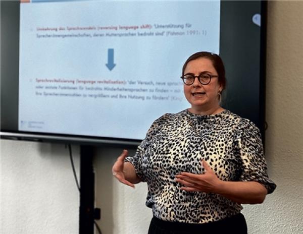 Z Města/Cottbus. Wót 29. septembra do 2. oktobra jo sociolinguistika dr. Ruth Kircher z Flensburga wóglědała do Dolneje Łužyce. Pśi tom jo wopóznała źěło Serbskego instituta, jo rozpšawiła wó swójej ekspertize wót slěźenja z nowymi powědarjami a jo hospitěrowała pśi serbskej imersiji.