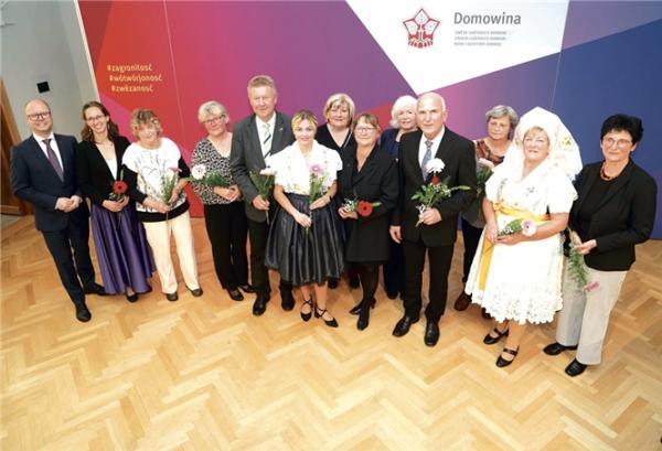 Z Budyšyna/Bautzen. Pód motom „Zagronitosć, wótwórjonosć, zwězanosć“ jo Domowina pětk, 17. oktobra, zasłužbnych Serbow wuznamjeniła. Na swětosnem zarědowanju jo pśedsedaŕ Domowiny Dawid Statnik w Budyšynje angažowanym Serbowkam a Serbam Myto Domowiny, Myto Domowiny za dorost a Cesne znamuško pśepódał. Wó muzikaliske wobrubjenje stej se póstarałej Milena Wowčerjec a Matej Dźisławk.