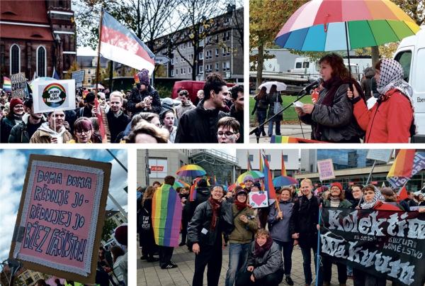 Na 17. Christopher-Street-Day w Chóśebuzu jo se wobźěliła teke kupka Serbowkow a Serbow pód tycoweju a serbskeju fonu, aby za tolerancu a pšawa LGBTQI+ community demonstrěrowała. Fota: A. Batke/K. P.