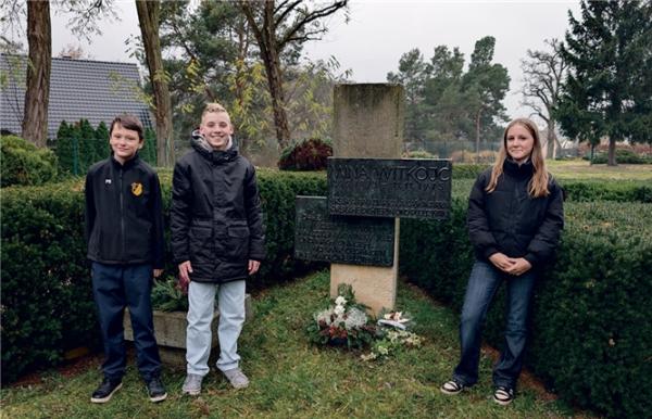Dwě wuknicy a wuknik z bórkojskeje šule pśed rowom Miny Witkojc. Foto: Amt Bórkowy
