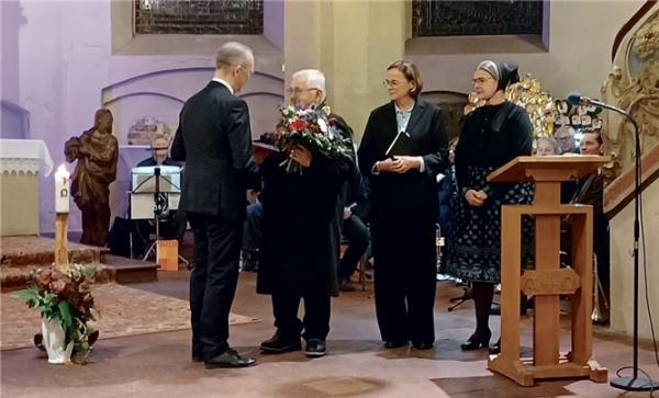 Srjodu tyźeń w lubinskej cerkwi Paula Gerhardta: Prezes synody EKBO Harald Geywitz se rozžognujo z Manfredom Hermašom. Foto: M. Norberg
