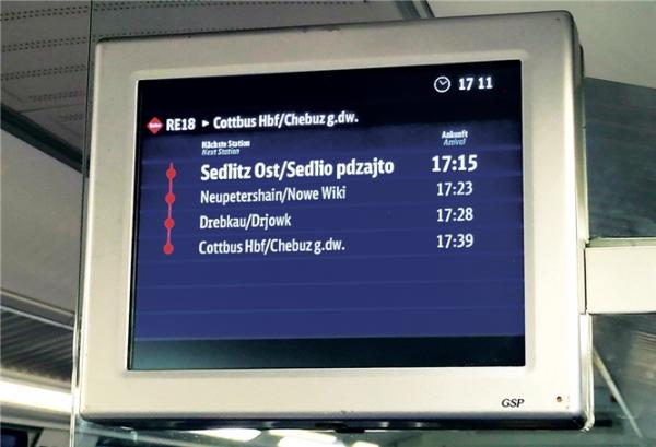 Z Łužyce/Lausitz. DBRegio ako za regionalne śěgi na wěstych linijach zagronite pśedewześe se južo wšake lěta procujo, serbsku rěc integrěrowaś do informacijow za drogujucych. Mjaztym jo juž lěta dłujko standard, na monitorach w śěgach pokazaś dwójorěcne mjenja dwórnišćow w serbskem sedleńskem rumje. Až jo hyšći njewótzamknjony proces móžomy rowno wiźeś w śěgach mjazy Chóśebuzom a Złym Komorowom. W staršych śěgach dajo hyšći software, kótaraž ma techniske śěžkosći ze wšakimi serbskimi pismikami, kótarež pón feluju. Nowša software z tym njama wěcej žedne problemy. Dla togo jo se zeleznica pak za to rozsuźiła njewužywaś aktualne městne zapiski serbskego sedleńskego ruma w Bramborskej ale widobnje jo ako žrědło wzeła stare zapiski wót NDRskeje Deutsche Reichsbahn (DR). Tak wiźimy teke Ruhland/Rólany a Lauchhammer/Łuchow dwójorěcnje. To jo DR w 1950tych lětach zawjadła a kóńc 1960tych lět zasej reducěrowała. Ruhland/Rólany jo pak zachopjeńk 2000tych lět južo raz slědk pśišeł, ako su dwójorěcne kursowe knigły z jězdnymi planami zasej krotkocasnje wózjawili.