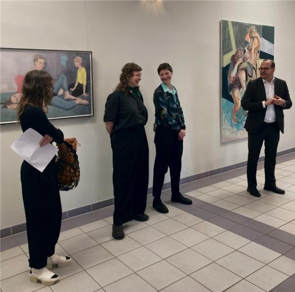 Z Pódstupima/Potsdam. Slědny tyźeń stwórtk jo se w bramborskem krajnem sejmje, ga we foyerje Ministaŕstwa za wědomnosć, slěźenje a kulturu, na 2. nastwaŕku, wótwóriła wustajeńca „In die Ruhe fallen“ z twóŕbami Helle Stoleccyc a Anny M. Kempe. Kužda zwuraznijo swóju perspektiwu na temy wokoło bliskosći, pśisłušnosći a změny. Hella Stoleccyc, dorostowa nosaŕka Bramborskego wuměłstwowego myta 2023, jo w serbskem swěśe wótrosła, ale „pokažo, až serbska kultura jo wjele wěcej ako muzealne konserwěrowanje abo folkloristiska dekoracija“, jo gronił Tobias Dünow, kulturny statny sekretaŕ a zagronity kraja za serbske nastupnosći, pśi wótwórjenju wustajeńce. „W zgromadnem statkowanju z akwarelami wót Anny M. Kempe, kótarež wulicuju wó cłowjeskich pótrjebnosćach mjazy distancu, wěstosću a njewěstosću, nastanjo zapśimujucy dialog.“