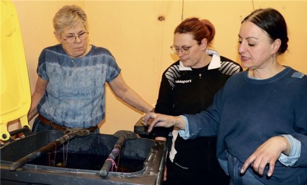 Gespannt werden die Stoffbeutel im Färbebad beobachtet. Fotos: R. Karge