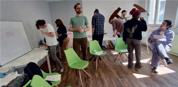 Wobźělnice a wobźělniki wulicowańskeje źěłaŕnicki se wopóznawaju z powěsćowymi tekstami, kótarež jo Patrick Niegsch (tśeśi wótlěwa) za nich z knigłow łužyskich powěsćow pśigótował. Foto: J.-F. K.